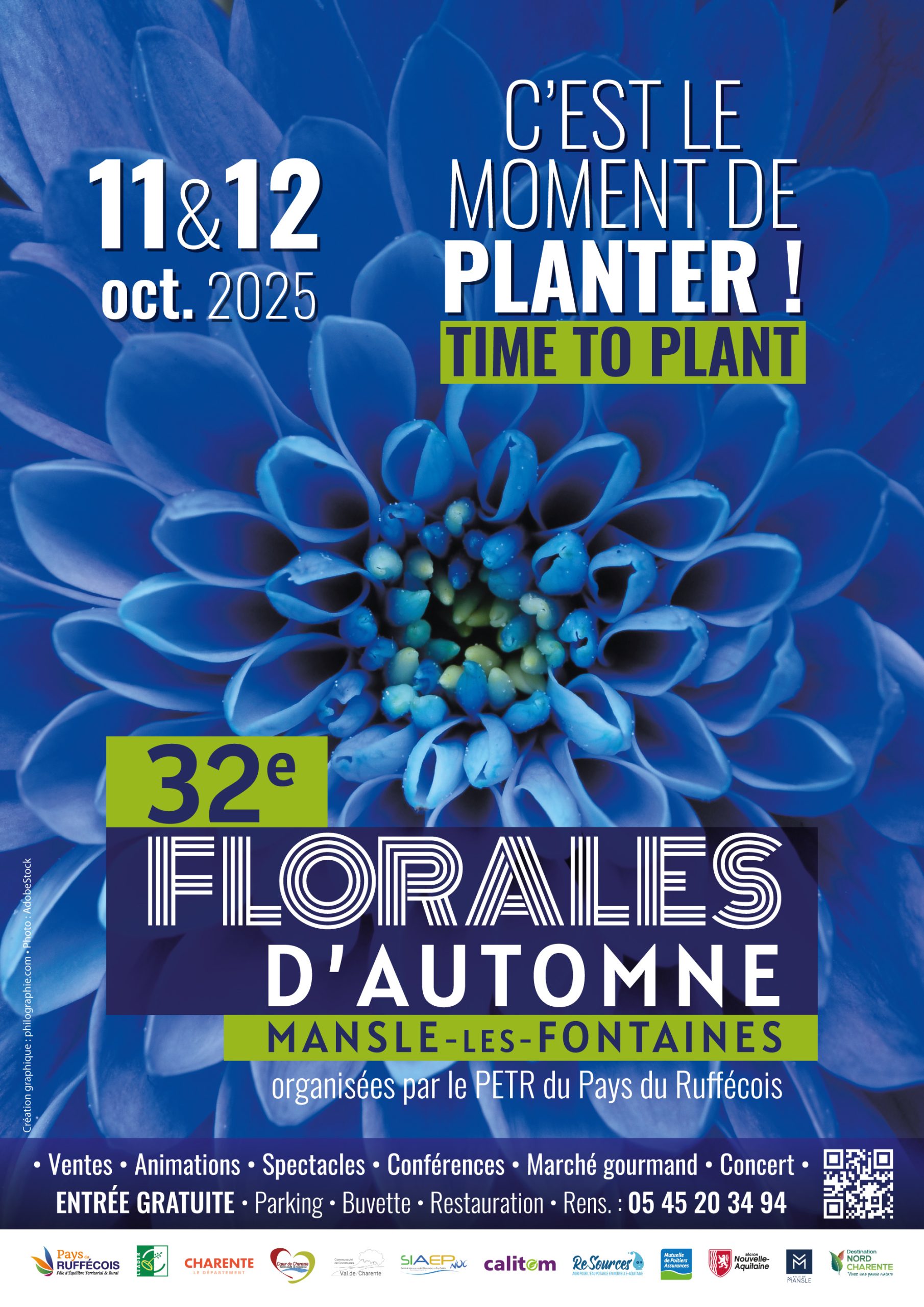 Cette 32ème édition des Florales d'Automne du PETR du Pays du Ruffécois se déroulera les 11 & 12 octobre 2025 toujours dans le Parc Florale J.P LANSON à Mansle-les-Fontaines et aura pour thème "Le pouvoir des plantes et l'économie circulaire".
