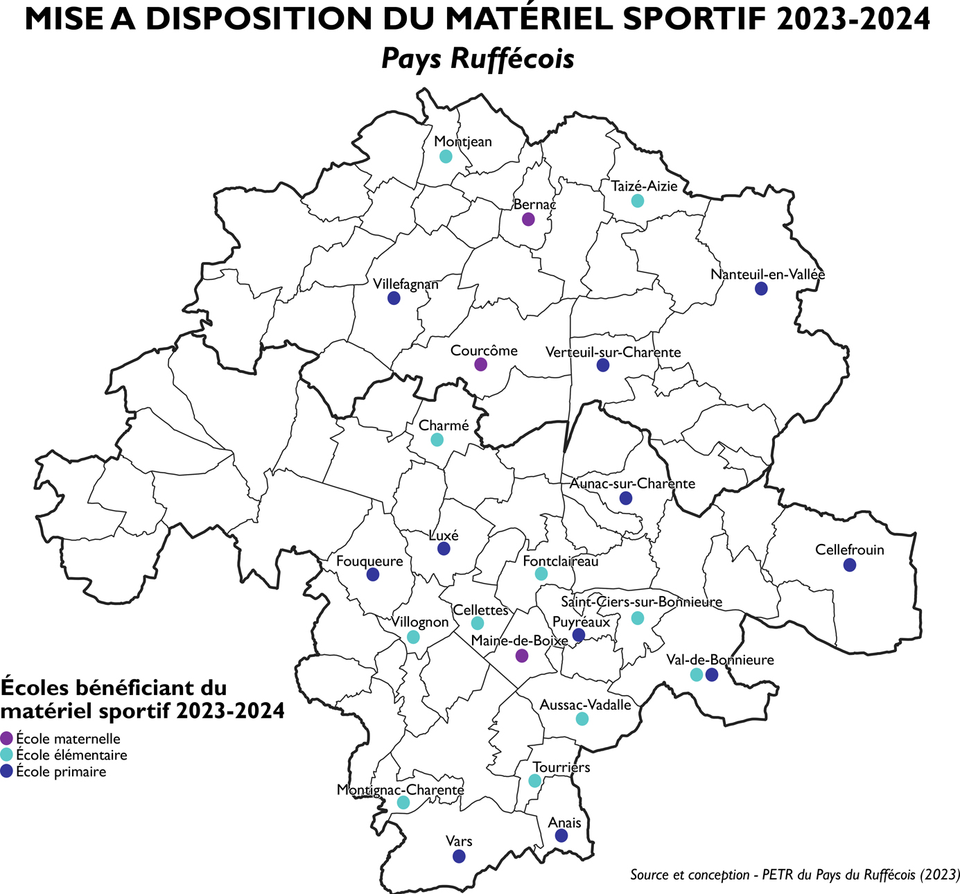 Depuis 2008, le Pays Ruffécois met à disposition des écoles du territoire les plus éloignées des équipements sportifs, du matériel pendant le temps scolaire (TAP inclus) pour :